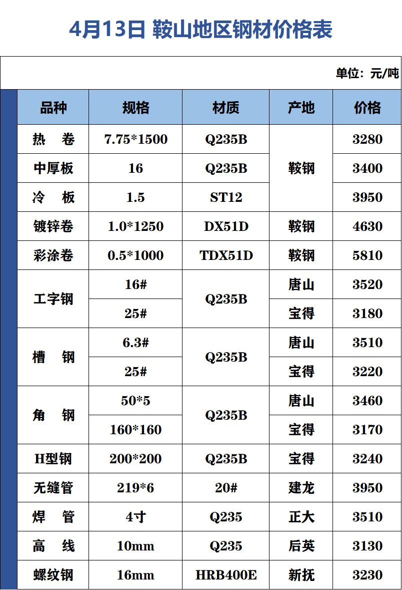 4月13日 鞍山地區(qū)鋼材價格表